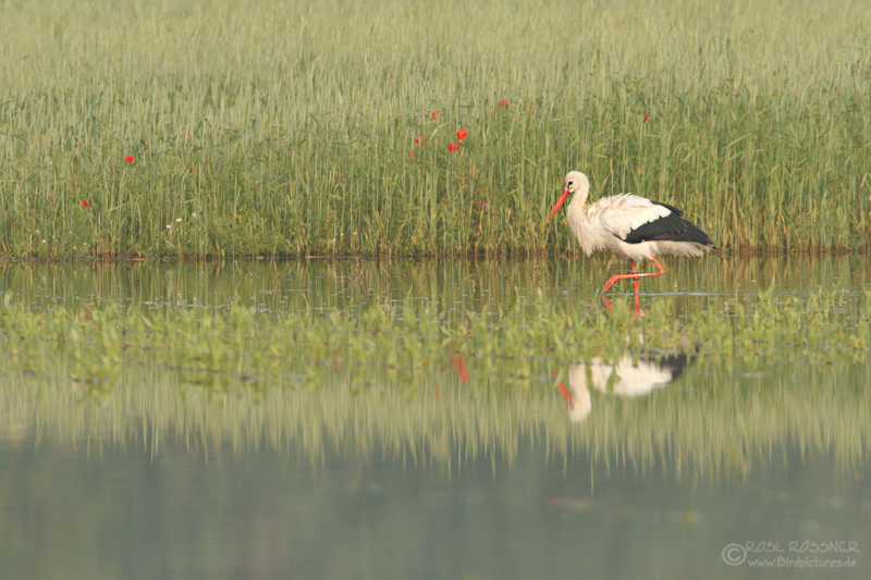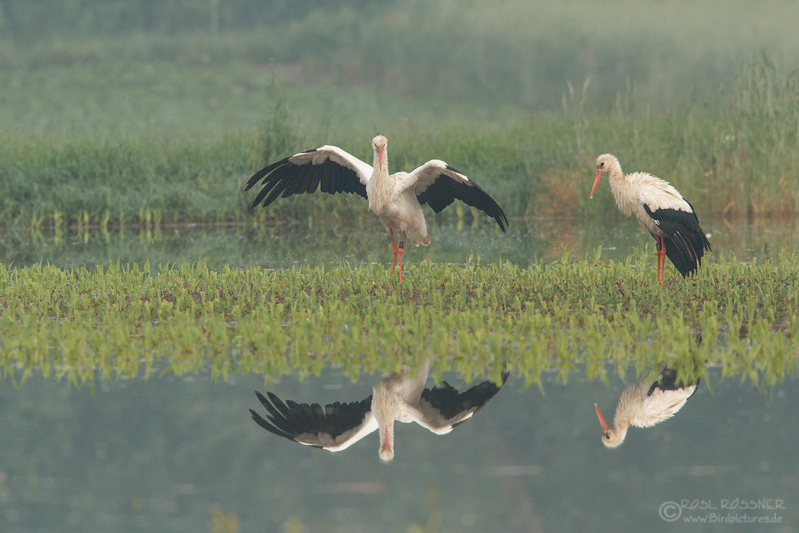 13. Juni 2013Es war ganz früh am Morgen und es war noch feucht und leicht neblig. Da sah ich eine Gruppe Störche und war gebannt von den Farbtönen, den Spiegelungen und den herrlichen Bewegungen den Störche. |