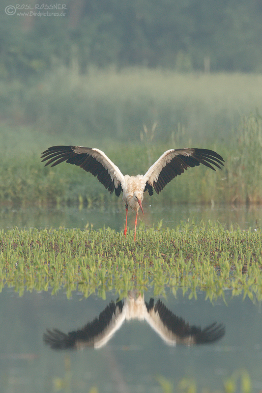 13. Juni 2013Es war ganz früh am Morgen und es war noch feucht und leicht neblig. Da sah ich eine Gruppe Störche und war gebannt von den Farbtönen, den Spiegelungen und den herrlichen Bewegungen den Störche. |