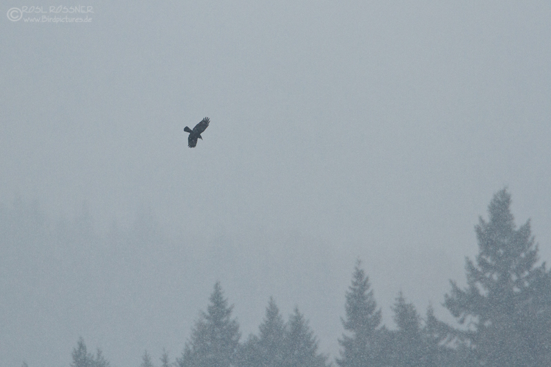 11. März 2013Die Kolkraben überflogen heute mehrfach das Gut Waldeck. Hier habe ich einen im dichten Schneegestöber erwischt... |