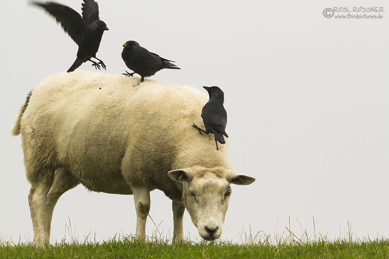 20. Oktober 2013Die Dohlen spielen auf einem Texelschaf |