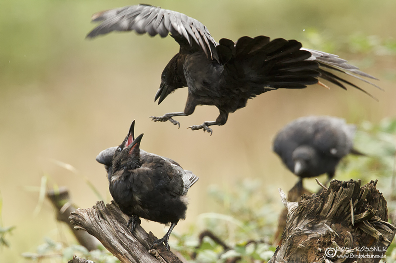 17. September 2013Zwei junge Rabenkrähen tragen einen spielerischen Streit aus, während die dritte das Geschehen interessiert aus dem Hintergrund beobachtet... |